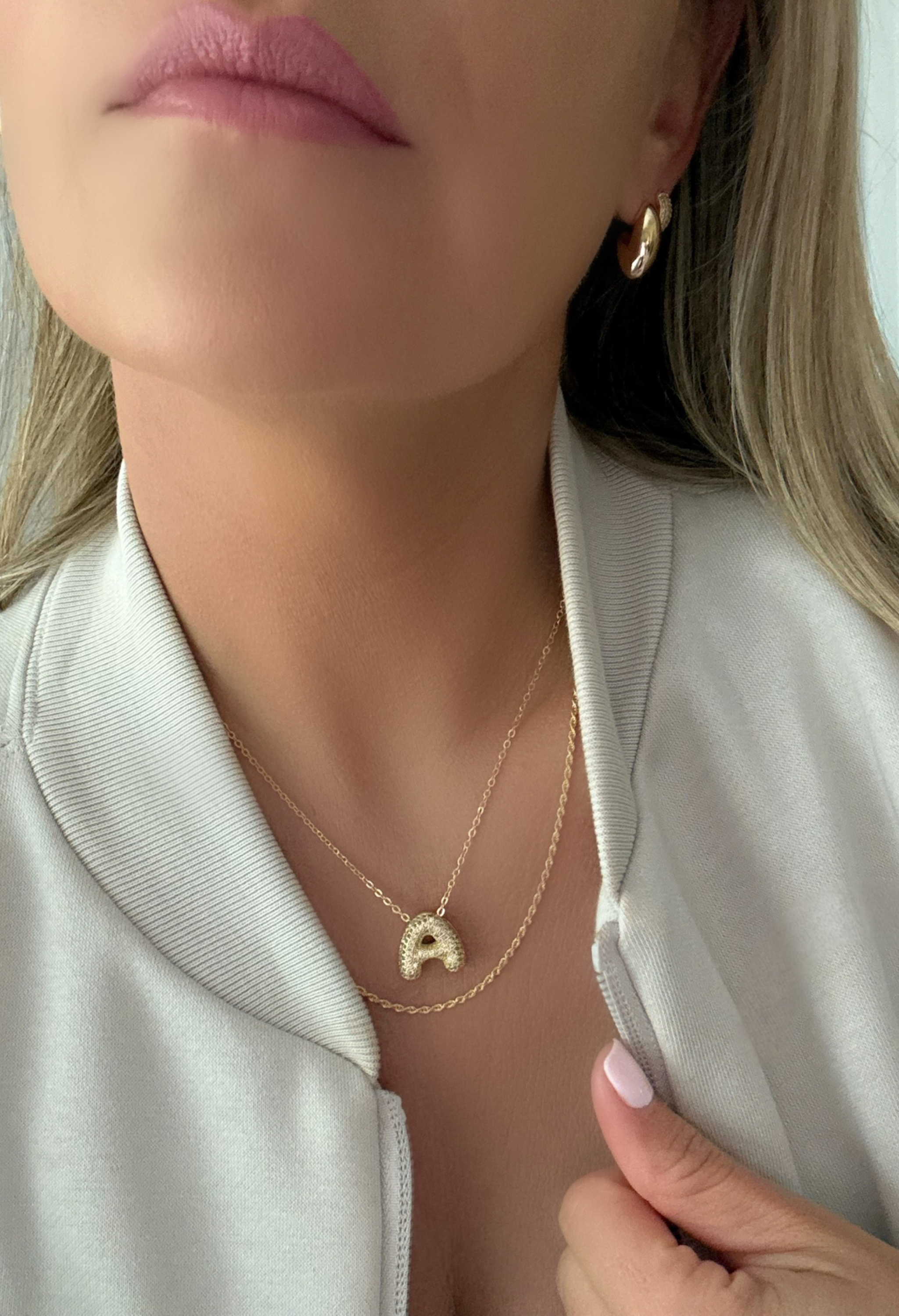 A polished bubble-letter initial set with cz diamond simulants on a delicate 18k gold-filled chain. Clean, modern, layer-ready.