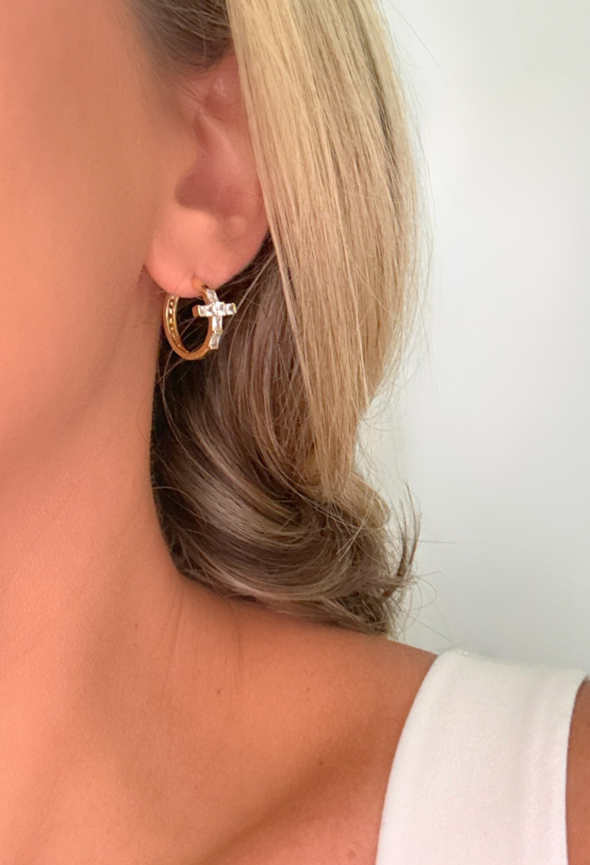 A delicate touch of shine. These Gold Diamond Crystal Cross Huggies feature a petite crystal-adorned cross, designed for effortless daily wear and thoughtful gifting.
